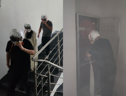 在演練活動(dòng)現(xiàn)場(chǎng),模擬8樓衛(wèi)生間處突發(fā)火災(zāi),集團(tuán)各樓層各部室隨即啟動(dòng)應(yīng)急預(yù)案,撲救組按動(dòng)火災(zāi)警鈴并進(jìn)行撲救,疏散組進(jìn)行引導(dǎo)疏散。員工在疏散過程中,彎腰低頭,用消防自救呼吸器或濕毛巾捂住口鼻,快速有序地從安全通道疏散樓梯向底層進(jìn)行撤離,最終撤離至辦公大樓前的安全地帶并進(jìn)行人數(shù)清點(diǎn)。