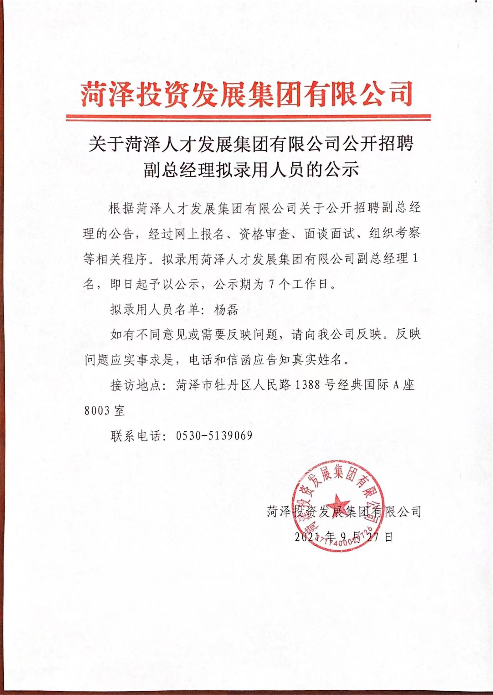 關(guān)于菏澤人才發(fā)展集團(tuán)有限公司公開招聘副總經(jīng)理擬錄用人員的公示