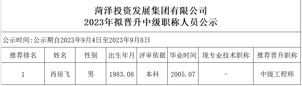 菏澤投資發(fā)展集團有限公司2023年擬晉升副高級職稱人員公示